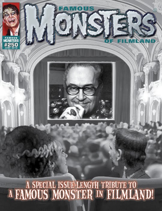 Just announced on the official FAMOUS MONSTERS OF FILMLAND website are pre-orders for the long-anticipated FM #250. The ship date is scheduled for sometime this June with a price tag of $9.95 (plus shipping). It is being billed as a Forrest J. Ackerman tribute issue. The theme is described as "tongue-in-cheek", which could end up being a number of things, including a parody. In any event, I surmise it will be a tasteful remembrance of Dr. Acula and will have to throw my pointy hat in the ring by pre-ordering myself sight unseen. Incidentally, there's lots of buzz happening over at the FM website, so get on over there and check it out. Subscribers were treated recently to a $5 off apparel coupon. They've got loads of hats, shirts and other goodies. And, if they come with the monster babes who are modelling these rags, I'm buying several myself! Go shopping at the link on the ribbon to the right of this here blogroll.