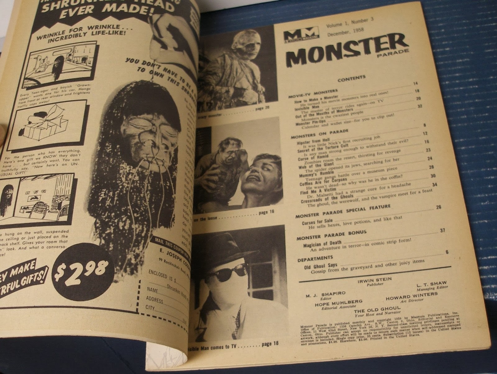 MONSTER PARADE hit the stands in September, and in October, a close copy of FM (including its title) called WORLD FAMOUS CREATURES appeared. Both titles succumbed after only 4 issues. It wouldn't be until January 1962, with the publication of CASTLE OF FRANKENSTEIN, that there would be another monster magazine with any notoriety.