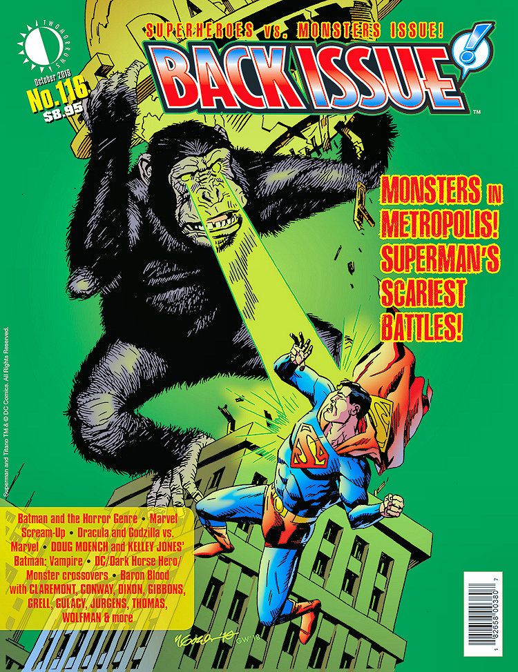 Back Issue #116 dukes it out with Superheroes vs. Monsters! Monsters in Metropolis, Batman and the Horror Genre, Doug Moench and Kelley Jones' Batman: Vampire, Marvel Scream-Up, Dracula and Godzilla vs. Marvel, DC/Dark Horse Hero/Monster crossovers, and a Baron Blood villain history. Featuring Chris Claremont, Gerry Conway, Chuck Dixon, Dave Gibbons, Mike Grell, Paul Gulacy, Dan Jurgens, Roy Thomas, Marv Wolfman, and more, under a Superman vs. Titano cover by Michael Golden! Edited by Michael Eury.