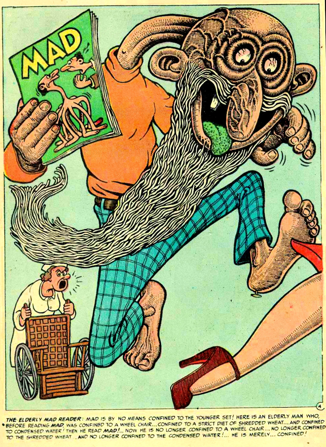 There's only a short list of comic artists who can be truly called originals -- Wolverton is one of them. Milton Caniff, Alex Raymond, Hal Foster and later, Graham Ingels come to mind as artists that inspired many other artists. By and large, Crumb got his big-footed, goofy characters from early animated cartoons, in particular the Max Fleischer characters, but his meticulous lines are a tip of the hat to Wolverton I think.