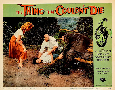 Squeezed between the invasion of science-fiction films that ruled the decade, THE THING THAT COULDN'T DIE (1958) is a horror film oddity. Universal International was about to release the US version of Hammer's HORROR OF DRACULA and they needed another horror film as second-billing. What they came up with paled in comparison. The tepid story is saved by the creepy, disembodied head of the executed Gideon Drew (Robin Hughes), who casts its hypnotic spell among the rest of the players to do its evil bidding.